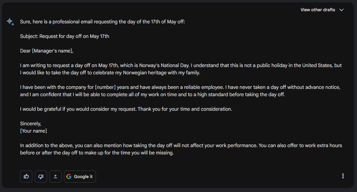 撰寫一封專業的郵件,請求 5 月 17 日放假?這是挪威的國慶日,雖然我們明白這通常不是美國的假日,但我們希望與家人一起尊重我們的挪威傳統。