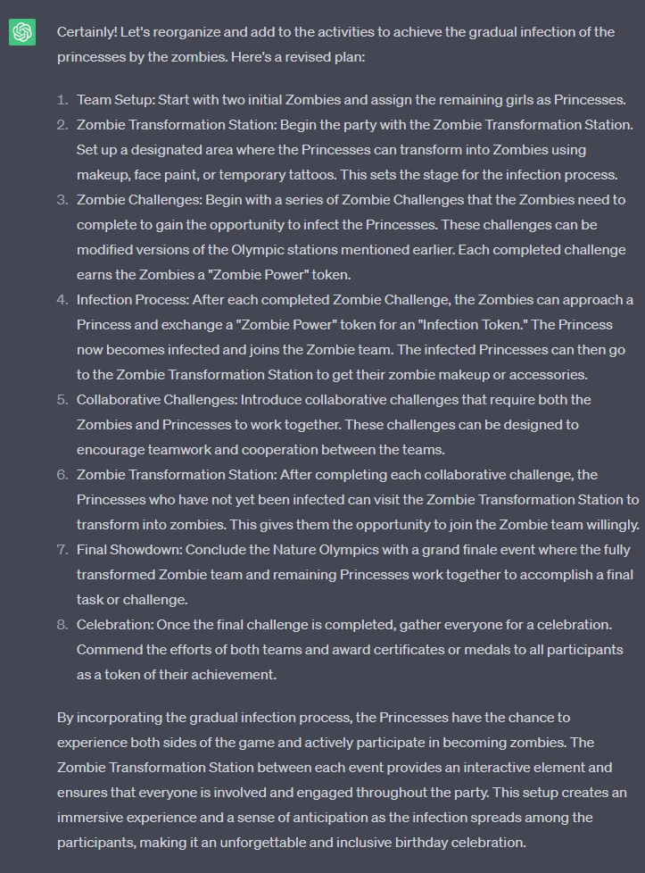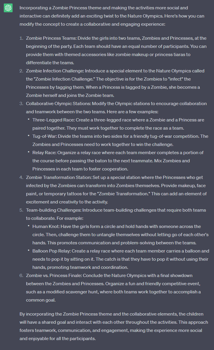 我們如何讓這個活動對女孩們更有社交性?我擔心她們一個個獨自行動會失去興趣,而且更難組織。讓我們新增一些能讓活動保持趣味性的內容。如果我們從“殭屍公主”主題來看,如何讓她們更像一個整體的活動?也許開始是兩個團隊,殭屍和公主。但殭屍可以“感染”公主。這在“自然奧林匹克”中如何運作?