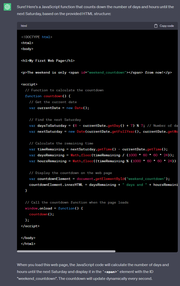 例如,寫“建立一個計算到下一個星期六的天數和小時數的函式”,而不是“編寫程式碼查詢最近的星期六”。