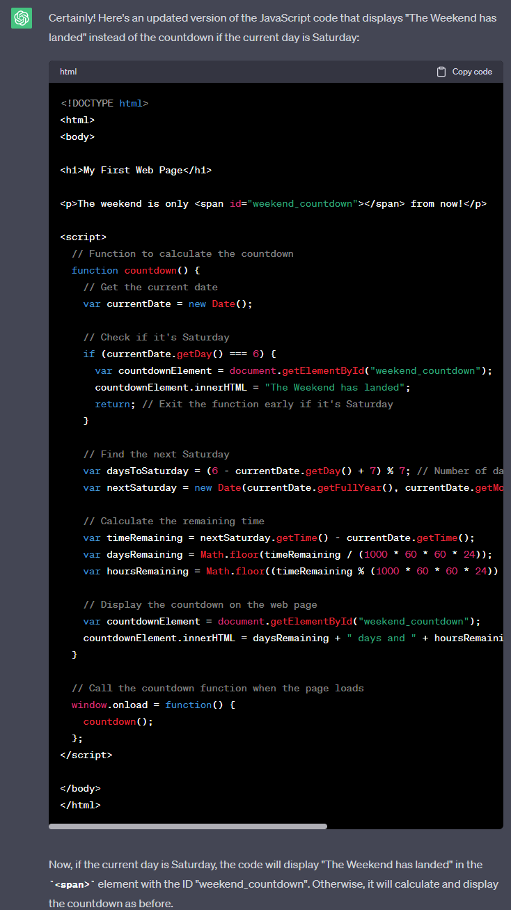 如果今天是星期六,新增程式碼顯示“週末到了”,而不是倒計時。