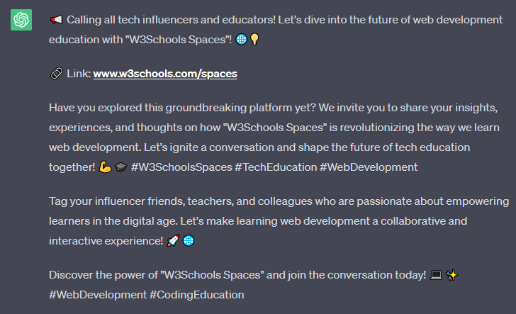建立一個 Facebook 帖子,邀請技術影響者和教師討論“W3Schools Spaces”。包含產品連結。