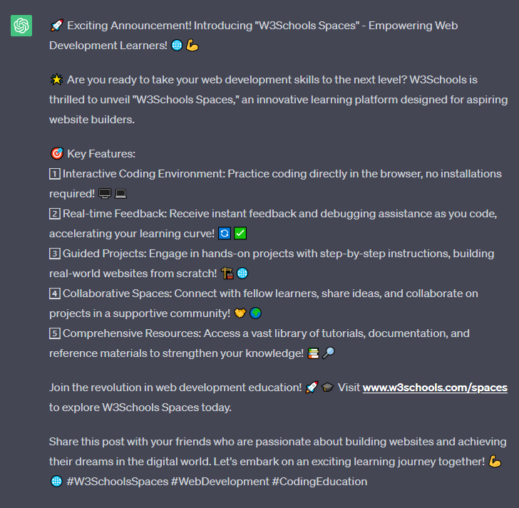 建立一個 Facebook 帖子,宣佈“W3Schools Spaces”及其針對學習構建網站的人的關鍵功能