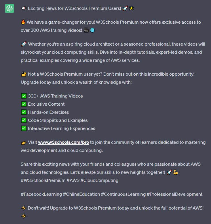 建立一個關於“300+ AWS 培訓影片”現已包含在 W3Schools Premium 使用者中的 Facebook 帖子。包含一個行動號召。