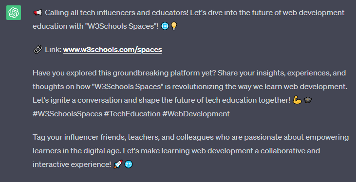 建立一個 LinkedIn 帖子,邀請科技影響者和教師討論“W3Schools Spaces”。包含產品連結。