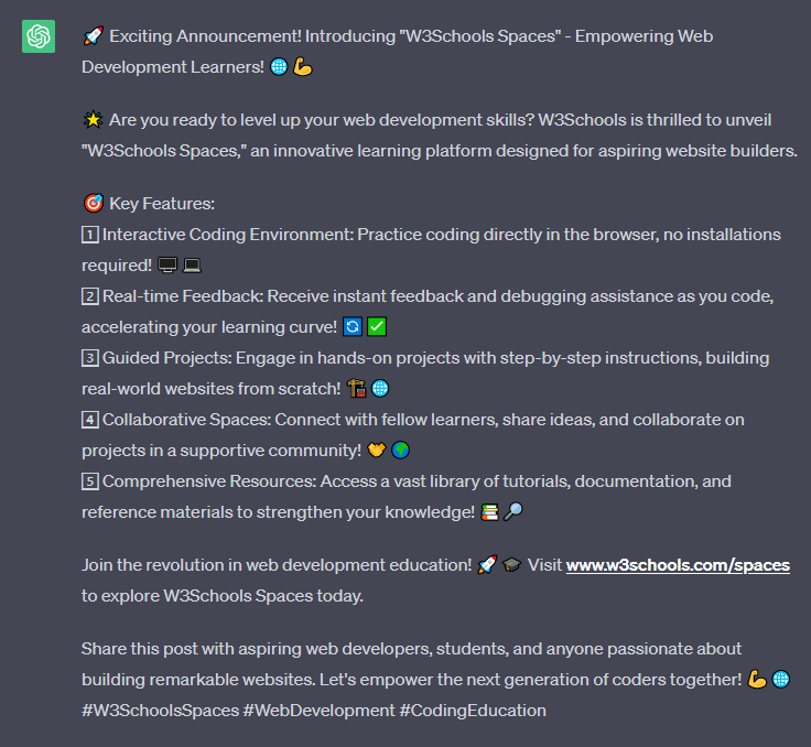 建立一個 LinkedIn 帖子,宣佈“W3Schools Spaces”及其面向正在學習構建網站的人們的主要功能。