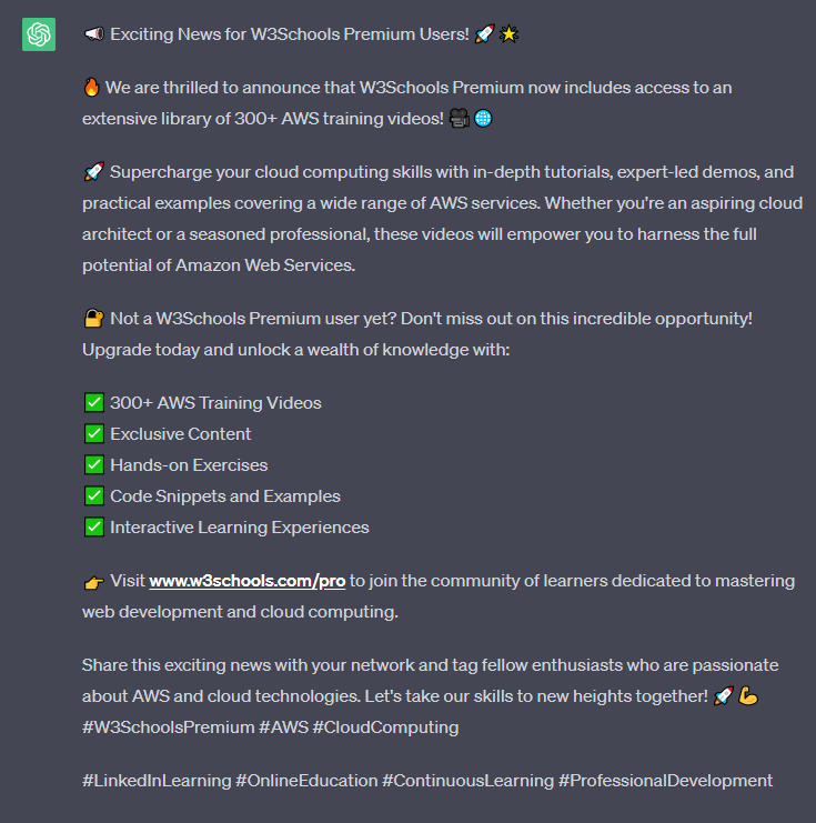 建立一個關於“300 多個 AWS 培訓影片”現已包含在 W3Schools Premium 使用者中的 LinkedIn 帖子。包含號召性用語。