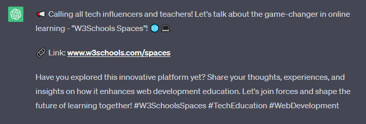 建立一條 Twitter 帖子,邀請技術影響者和教師討論“W3Schools Spaces”。包含產品連結。