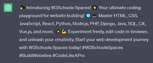 建立一條 Twitter 帖子,宣佈“W3Schools Spaces”及其面向網站開發學習者的關鍵功能。