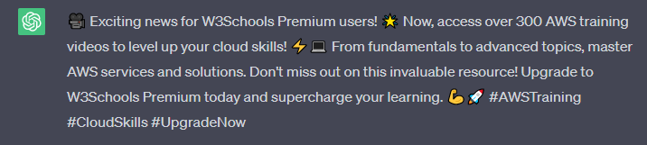 建立一條 Twitter 帖子,宣佈 W3Schools Premium 使用者現已包含“300 多個 AWS 培訓影片”。包含一個行動號召。