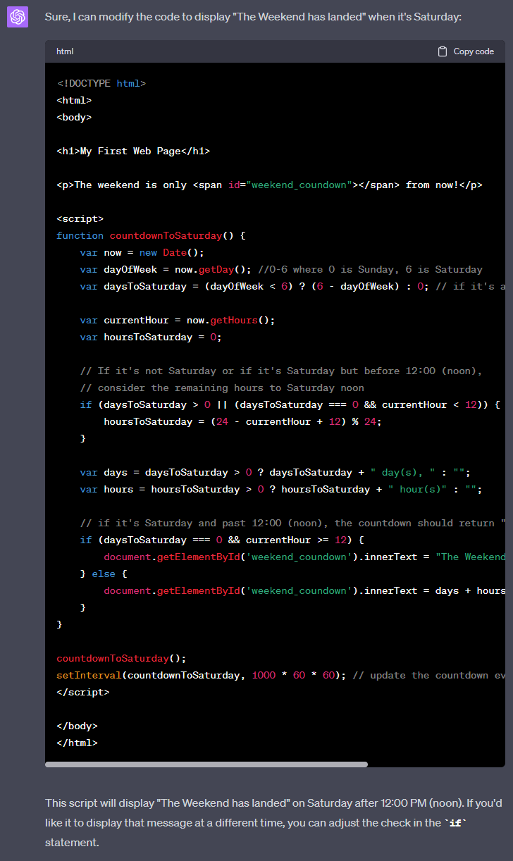 如果今天是星期六,則新增程式碼以顯示“週末已至”,而不是倒計時