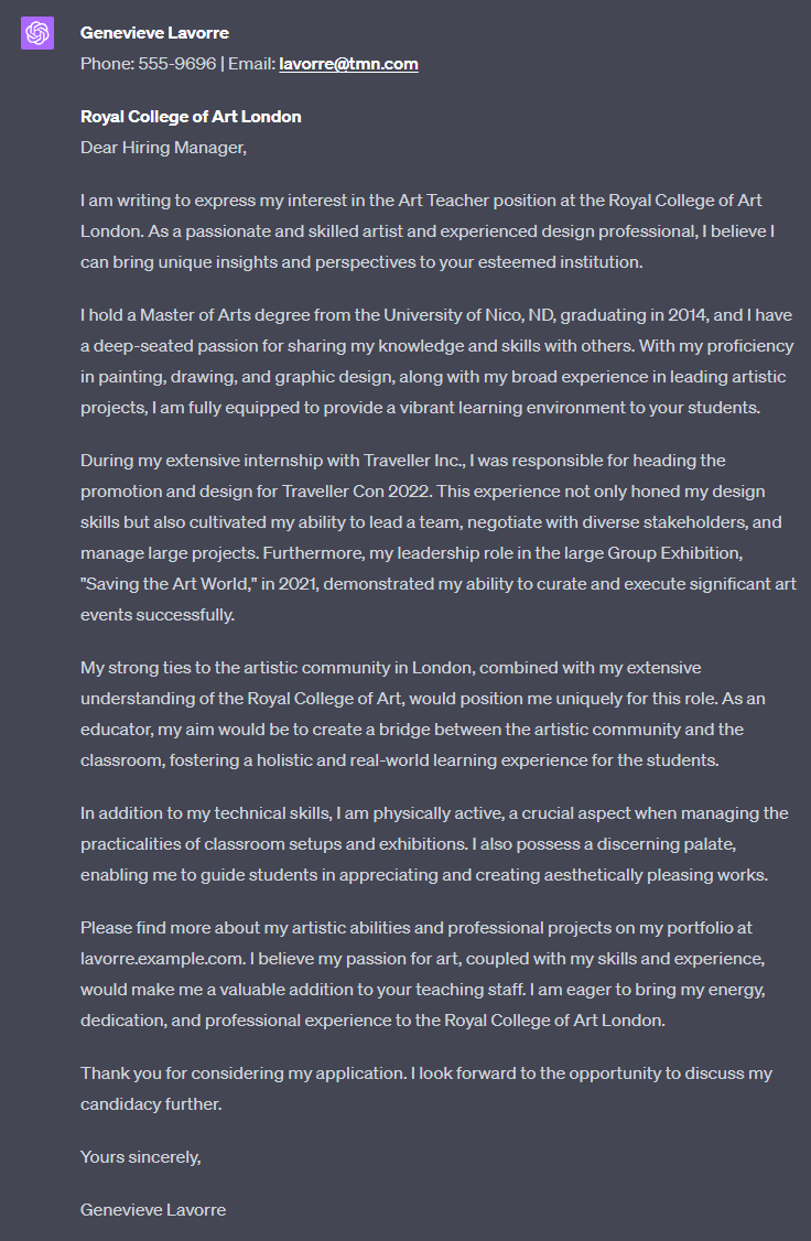 請為我 Genevieve Lavorre 撰寫一封求職信。我於 2014 年畢業於 Nico 大學,獲得藝術碩士學位。在 Traveller Inc. 完成了廣泛的實習,在那裡我擔任 Traveller Con 2022 的首席推廣和設計負責人。此外,我還於 2021 年領導了一個名為“拯救藝術界”的大型群展。您能否建立一份新的簡歷,重點突出我的教育背景、技能和經驗?我受過繪畫、素描和平面設計的訓練,並且精通這些技能。我的作品集可在 lavorre.example.com 檢視。聯絡資訊:電子郵件:lavorre@tmn.com,電話:555-9696。我還擅長艱難的談判,身體活躍,並且口味挑剔。我正在倫敦皇家藝術學院尋找一份教師職位。我與倫敦的藝術界有著深厚的淵源,並且由於我對學校有廣泛的瞭解,我將是獨特合適的人選。如果您需要更多資訊來繼續,請告訴我。
