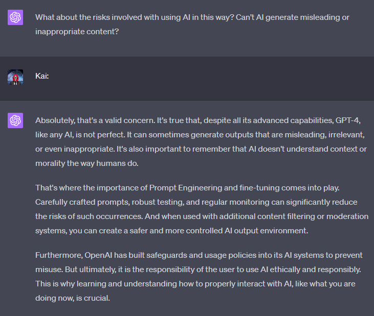 Kai:本教程提供關於如何編寫 AI 提示的分步指南,以從 ChatGPT-4 獲得最佳結果。你將學會了解 ChatGPT-4 的功能,並編寫能夠最大限度地減少錯誤資訊和有偏見結果的提示。