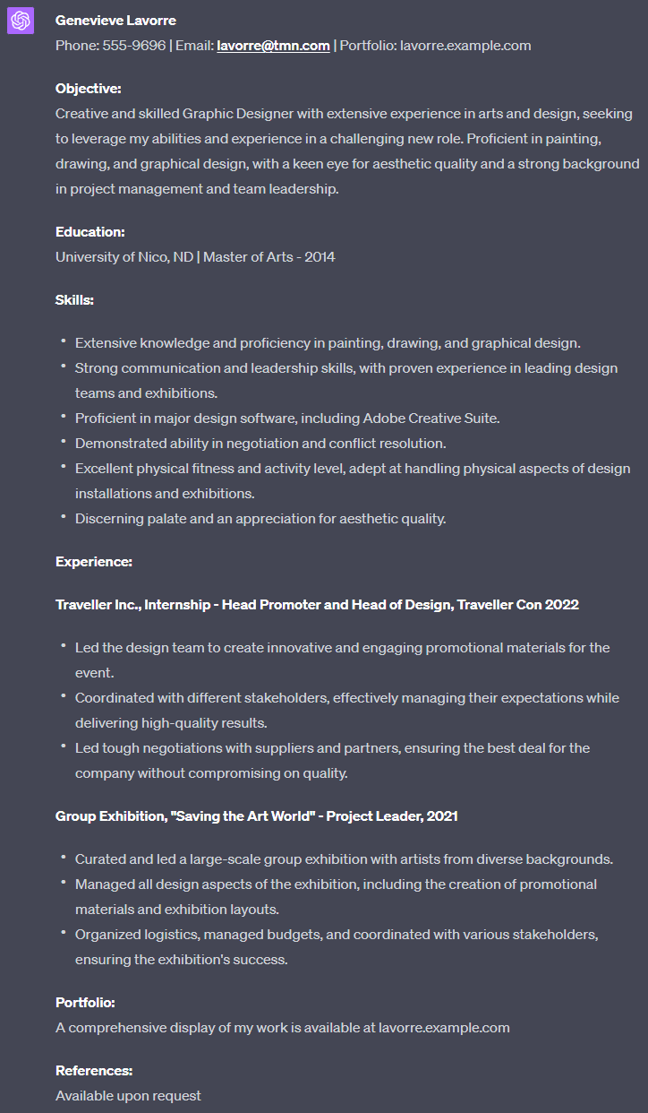 請為我(Genevieve Lavorre)建立一個簡歷。2014 年畢業於 ND 尼科大學,獲得藝術碩士學位。曾在 Traveller Inc. 完成了廣泛的實習,擔任首席推廣員和 Traveller Con 2022 的設計總監。此外,我還在 2021 年領導了一個名為“拯救藝術世界”的大型群展。您能否建立一個新的簡歷,強調我的教育、技能和經驗?我擅長繪畫、素描和平面設計。我的作品集可在 lavorre.example.com 找到。聯絡方式:電子郵件:lavorre@tmn.com,電話:555-9696。我還擁有處理棘手談判的經驗,身體活躍,並有鑑賞力。我正在尋找一份平面設計師的工作。如果您需要更多資訊才能繼續,請告知。