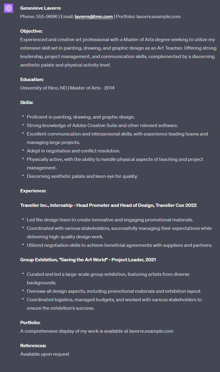 請為我(Genevieve Lavorre)建立一個簡歷。2014 年畢業於 ND 尼科大學,獲得藝術碩士學位。曾在 Traveller Inc. 完成了廣泛的實習,擔任首席推廣員和 Traveller Con 2022 的設計總監。此外,我還在 2021 年領導了一個名為“拯救藝術世界”的大型群展。您能否建立一個新的簡歷,強調我的教育、技能和經驗?我擅長繪畫、素描和平面設計。我的作品集可在 lavorre.example.com 找到。聯絡方式:電子郵件:lavorre@tmn.com,電話:555-9696。我還擁有處理棘手談判的經驗,身體活躍,並有鑑賞力。我正在尋找一份教師的工作。如果您需要更多資訊才能繼續,請告知。