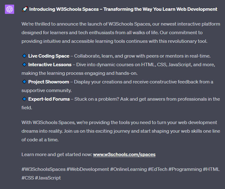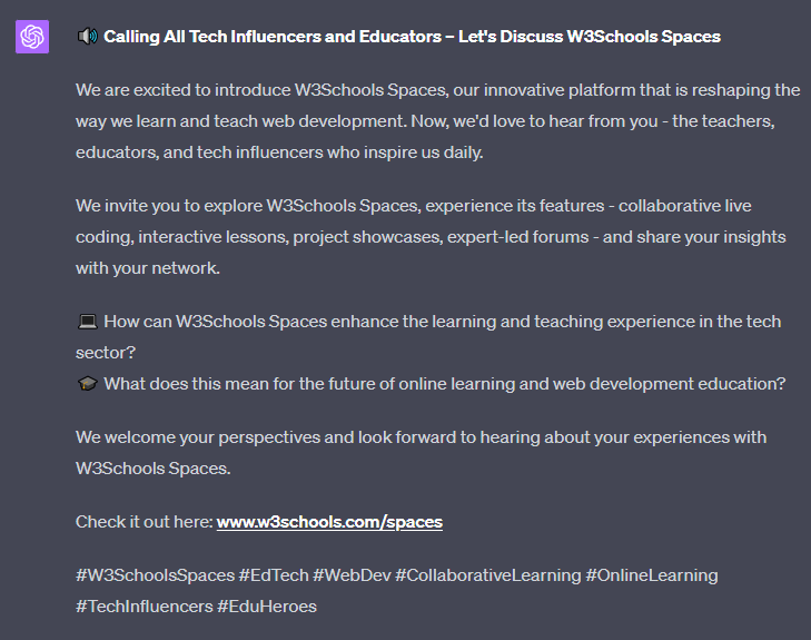 建立一個 LinkedIn 帖子,邀請科技影響者和教師討論“W3Schools Spaces”。包含產品連結。