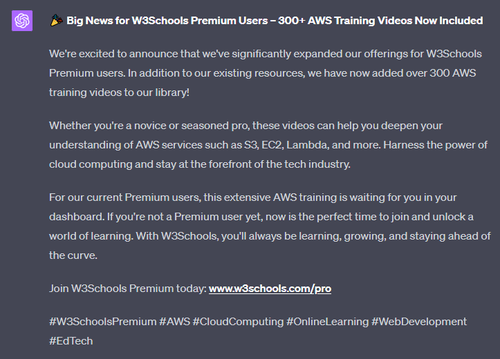 建立一個關於“300 多個 AWS 培訓影片”現已包含在 W3Schools Premium 使用者中的 LinkedIn 帖子。包含號召性用語。