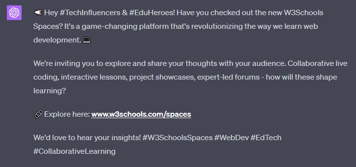 建立一條 Twitter 帖子,邀請技術影響者和教師討論“W3Schools Spaces”。包含產品連結。