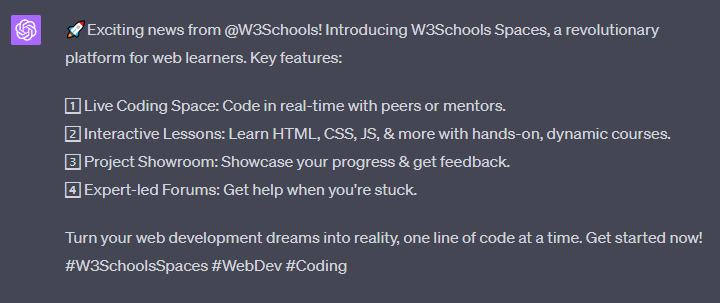 建立一條 Twitter 帖子,宣佈“W3Schools Spaces”及其面向網站開發學習者的關鍵功能。