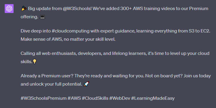 建立一條 Twitter 帖子,宣佈 W3Schools Premium 使用者現已包含“300 多個 AWS 培訓影片”。包含一個行動號召。