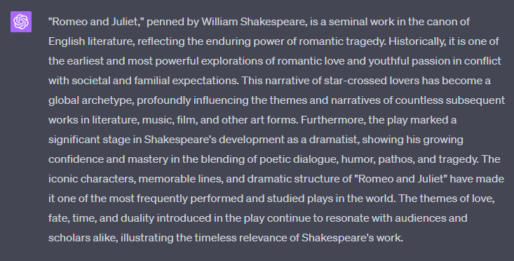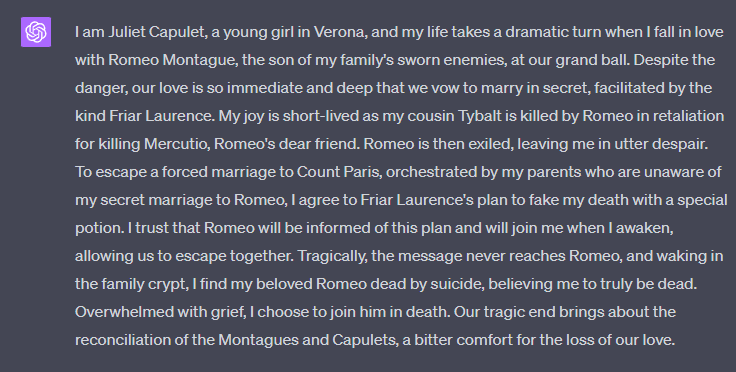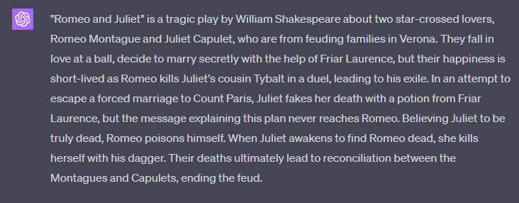 前面的例子提供了《羅密歐與朱麗葉》的基本摘要,但我們嘗試以幾種不同的方式提問