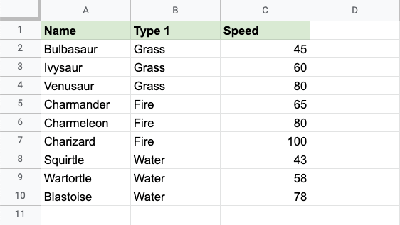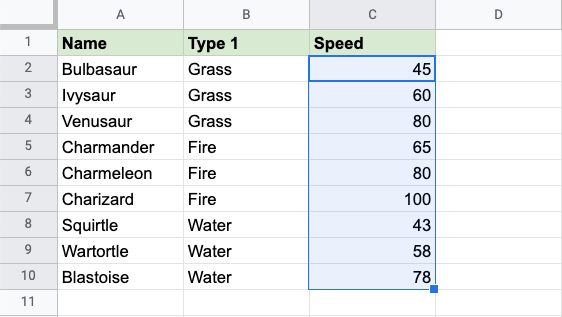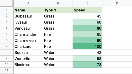 使用“顏色比例”條件格式化來突出顯示每隻寶可夢的速度值。