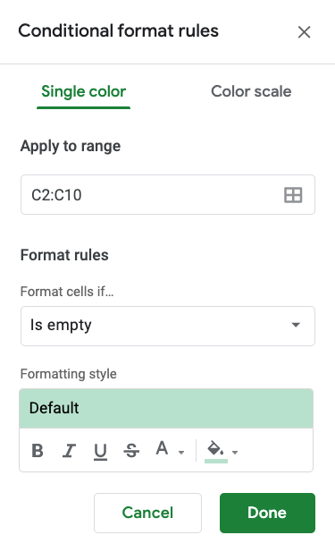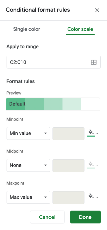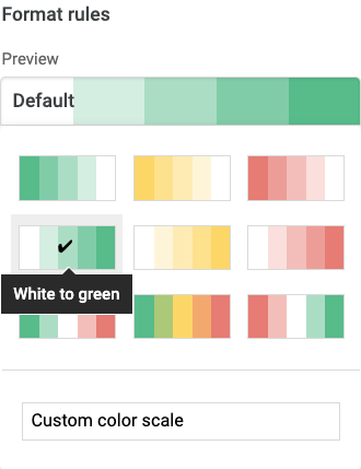 顏色比例是 Google 表格中預設的條件格式型別,用於突出顯示一組單元格,以指示單元格值的相對大小。