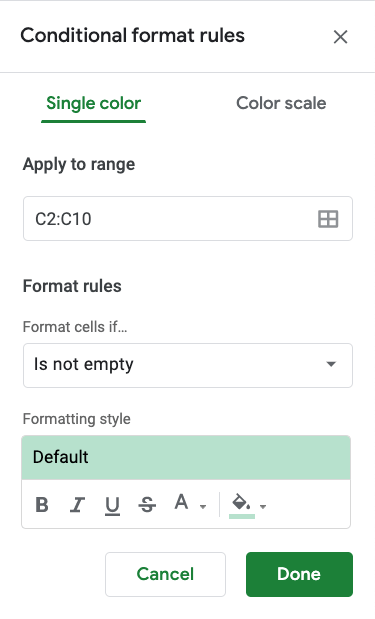 單色是 Google Sheets 中一種預設的條件格式型別,用於對所有符合**條件**的單元格應用可自定義的格式設定選項。