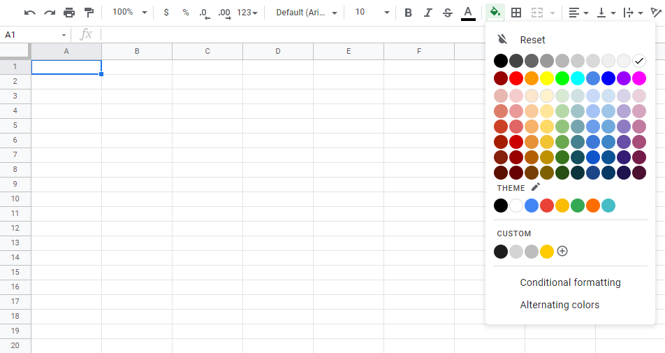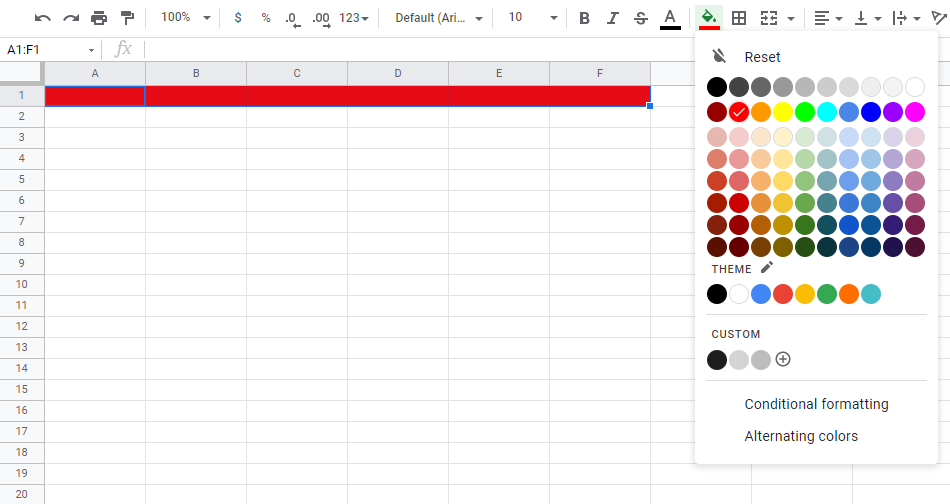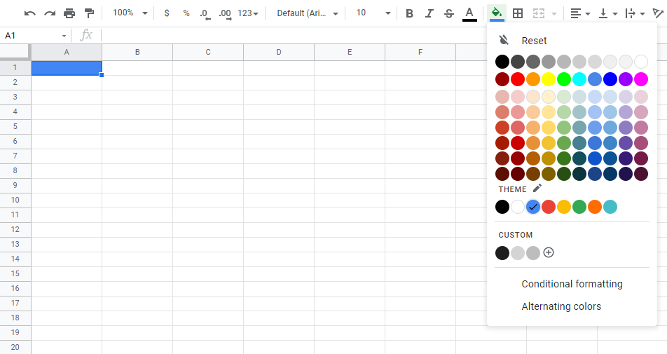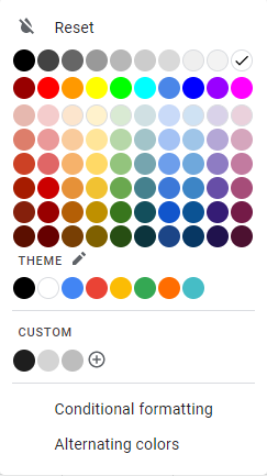 Google Sheets 具有一組可用的標準色、主題色和自定義顏色。您可以點選顏色來選擇它。