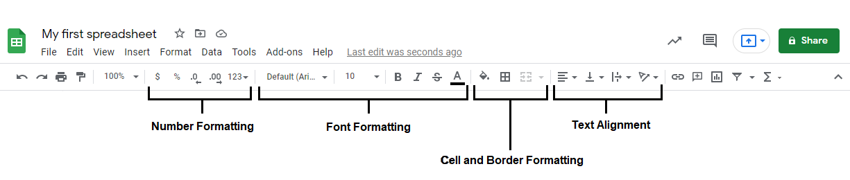有關功能區和選單的更多資訊,請參閱 Google Sheets 概述章節。