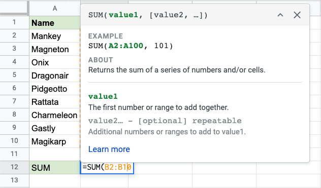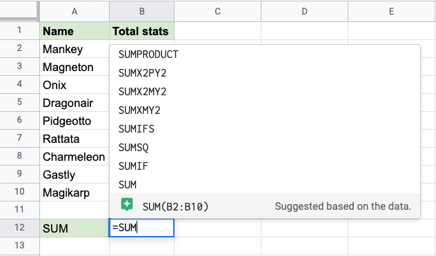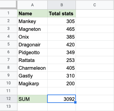 太棒了! 你已成功使用 =SUM 函式計算了統計資料的總和。寶可夢的統計資料總和為 3092。