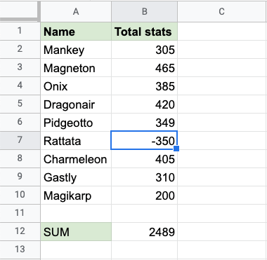 讓我們將 Rattata 的統計資料更改為負數,看看會發生什麼。在單元格 B7 中輸入 -350