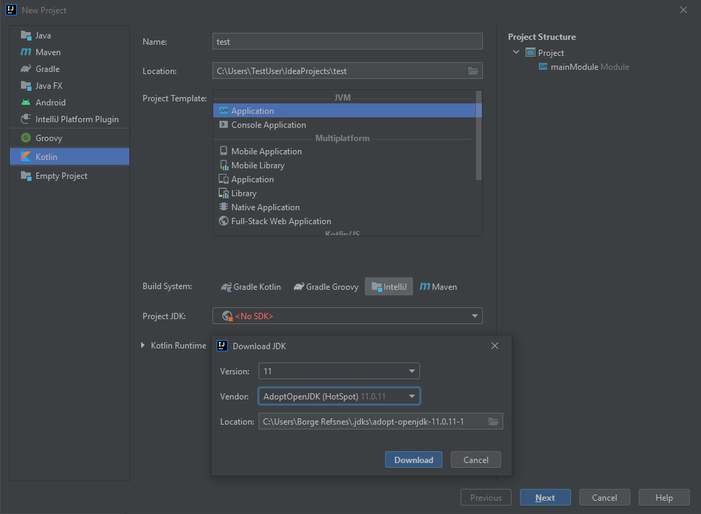 接下來,我們需要安裝名為 JDK(Java Development Kit)的軟體,以便啟動我們的 Kotlin 專案。點選“Project JDK”選單,選擇“Download JDK”,然後選擇一個版本和供應商(例如 AdoptOpenJDK 11),並點選“Download”按鈕。