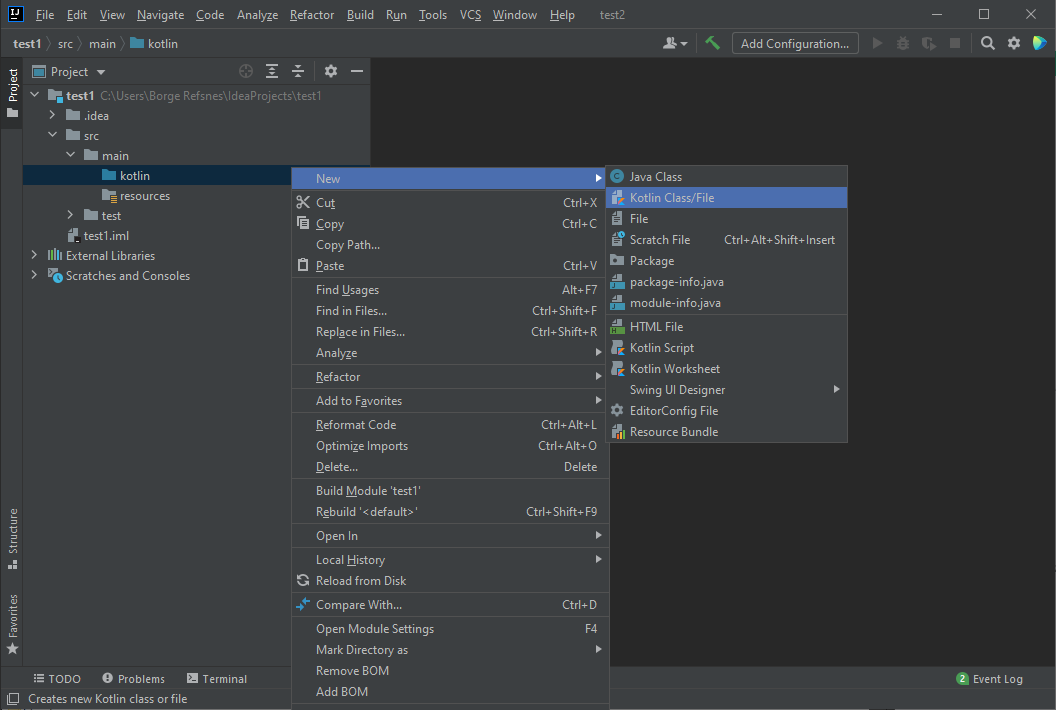 現在我們可以開始處理我們的 Kotlin 專案了。不用擔心 IntelliJ 中所有不同的按鈕和功能。現在,只需開啟 src(源)資料夾,然後按照下圖中的步驟,建立一個 kotlin 檔案。