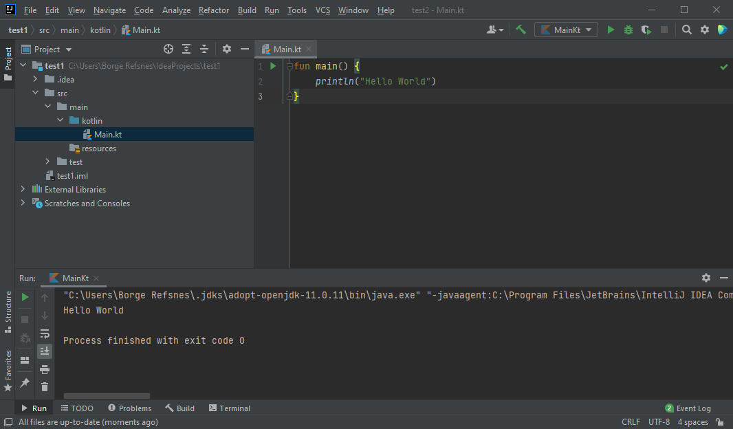 接下來,IntelliJ 將構建您的專案,並執行 Kotlin 檔案。輸出將類似於: