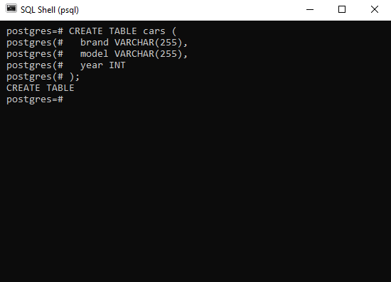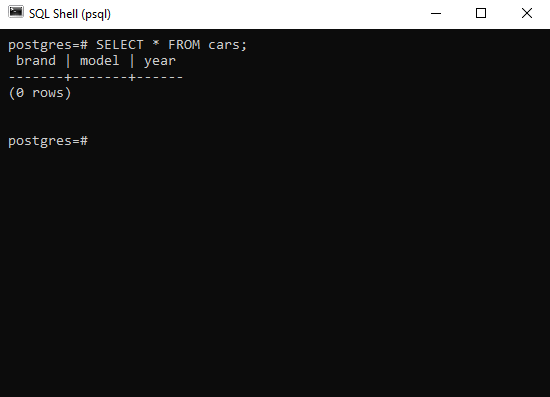 執行上述語句後,將建立一個名為 cars 的空表,SQL Shell 應用程式將返回以下結果:
