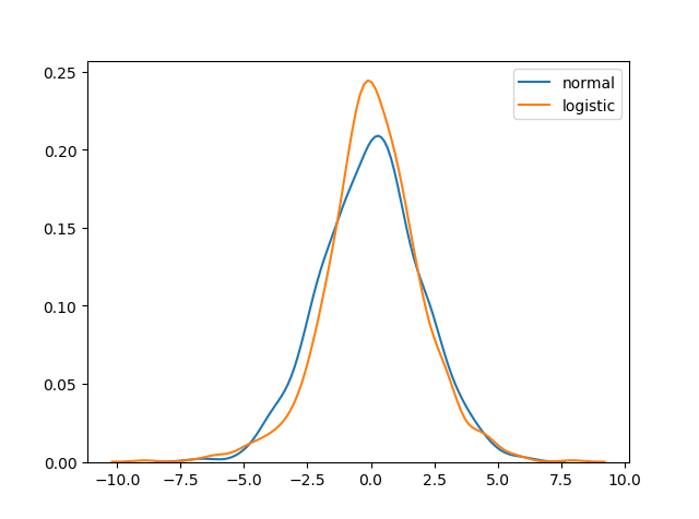 當 scale(標準差)值較高時,正態分佈和 Logistic 分佈除了峰值外幾乎相同。
