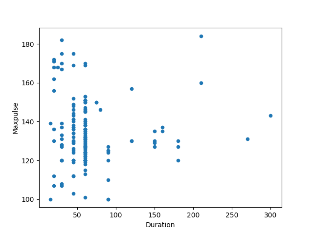 讓我們建立另一個散點圖,其中列之間存在不良關係,例如“Duration”和“Maxpulse”,相關性為 0.009403