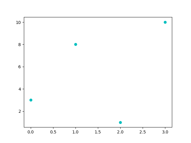 #Three lines to make our compiler able to draw: import sys import matplotlib matplotlib.use('Agg') import matplotlib.pyplot as plt import numpy as np ypoints = np.array([3, 8, 1, 10]) plt.plot(ypoints, 'oc') plt.show() #Two lines to make our compiler able to draw: plt.savefig(sys.stdout.buffer) sys.stdout.flush()