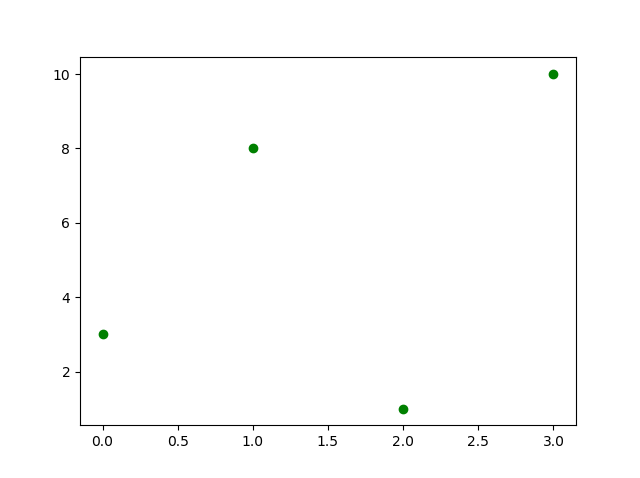 #Three lines to make our compiler able to draw: import sys import matplotlib matplotlib.use('Agg') import matplotlib.pyplot as plt import numpy as np ypoints = np.array([3, 8, 1, 10]) plt.plot(ypoints, 'og') plt.show() #Two lines to make our compiler able to draw: plt.savefig(sys.stdout.buffer) sys.stdout.flush()