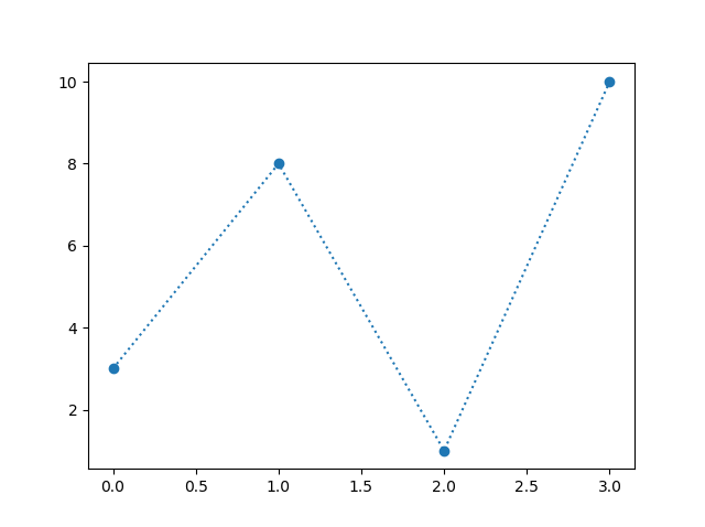 #Three lines to make our compiler able to draw: import sys import matplotlib matplotlib.use('Agg') import matplotlib.pyplot as plt import numpy as np ypoints = np.array([3, 8, 1, 10]) plt.plot(ypoints, 'o:') plt.show() #Two lines to make our compiler able to draw: plt.savefig(sys.stdout.buffer) sys.stdout.flush()