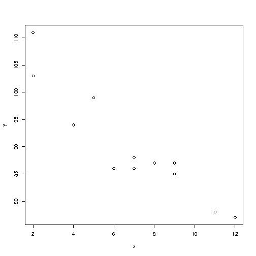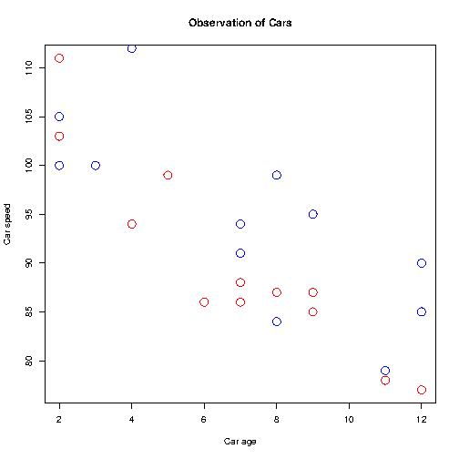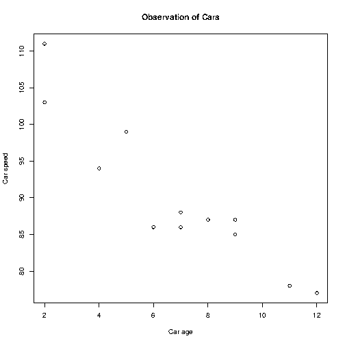 plot(x, y, main="車輛觀測", xlab="車齡", ylab="車速")